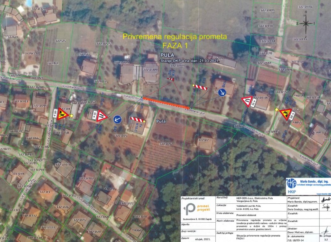 Za potrebe izvođenja radova na izgradnji NN priključka na elektroenergetsku distribucijsku mrežu za građevinu stambene namjene, trgovačkom društvu HEP – Operator distribucijskog sustava d.o.o. Elektroistra Pula, odobreno je izvođenje radova unutar građevine nerazvrstane ceste i uvođenje privremene regulacije prometa na dijelu Valdebečkog puta.
