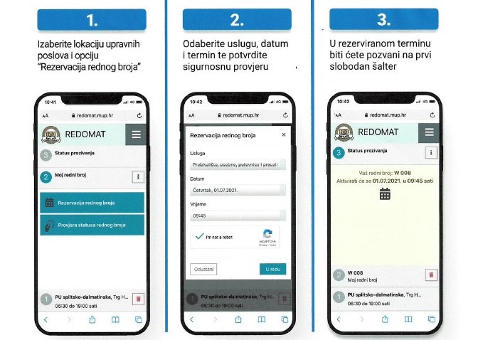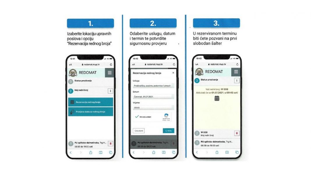 U sjedištu policijske uprave u Puli u primjeni je e-redomat za izdavanje brojeva građana. Građani svoj redni broj za pojedinu uslugu mogu neposredno preuzeti na redomat uređaju smještenom na ulazu u prostore upravnih poslova, a od ponedjeljka, 17. siječnja, u primjeni će biti i aplikacija za mobilni pristup redomat.mup.hr, putem koje će građani moći odabrati svoj termin i pratiti red čekanja.