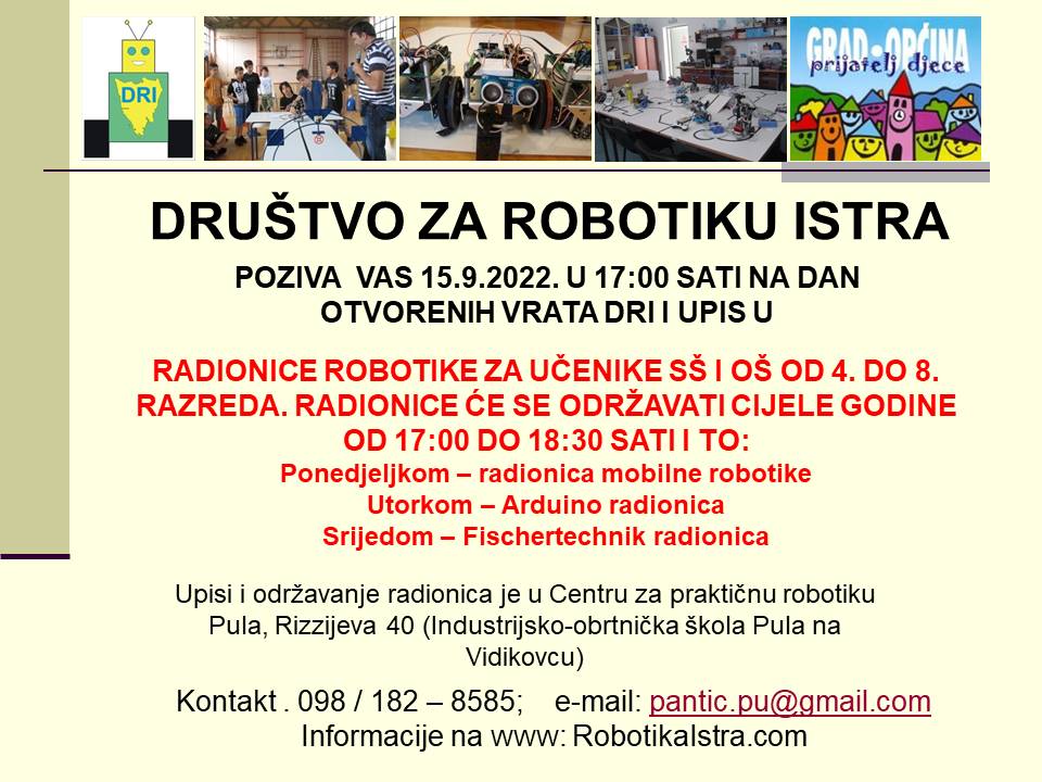 Društvo za robotiku Istra poziva vas u četvrtak 15.09.2022.godine od 17:00 do 18:00 sati Dane otvorenih vrata te upis u početne radionice robotike.