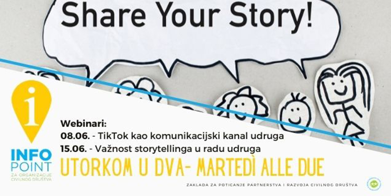 Zaklada za poticanje partnerstva i razvoja civilnog društva u sklopu svog Info pointa za udruge nastavlja s provedbom programa “Utorkom u dva” te najavljuje webinare “TikTok kao komunikacijski kanal udruga” i “Važnost storytellinga u radu udruga”.