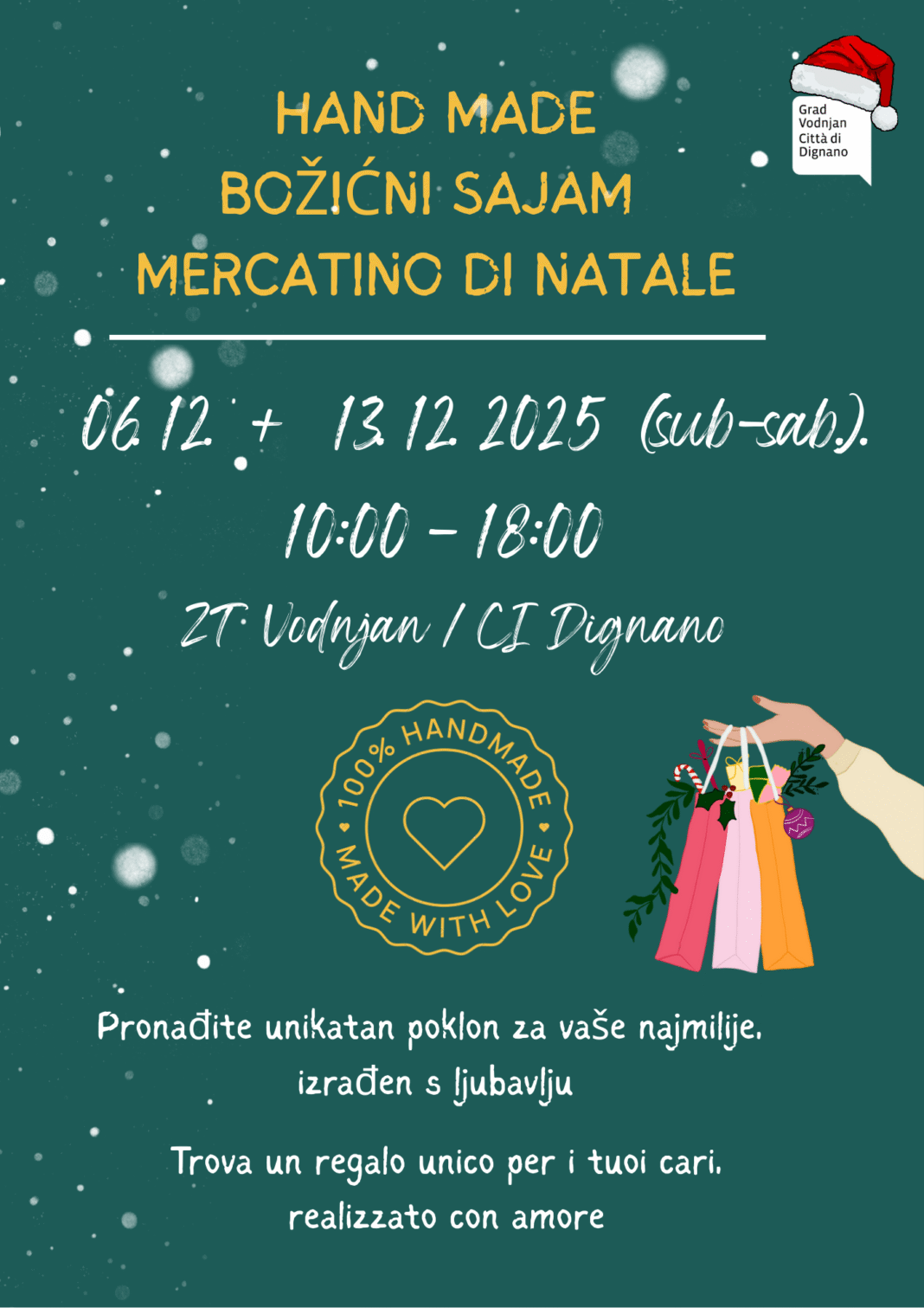Hand made božićni sajmovi, na kojima posjetitelji mogu pronaći unikatne, ručno izrađene poklone, održavaju se dvije subote – 6. i 13. prosinca – u Zajednici Talijana Vodnjan od 10:00 do 18:00 sati.