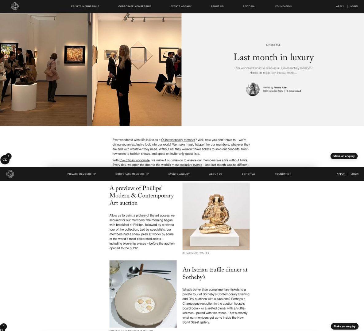 U listopadskom izdanju online magazina Quintessentially, autorica Amelia Allen donosi pregled ekskluzivnih događanja kojima su prisustvovali članovi ove prestižne globalne lifestyle concierge zajednice, poznate po vrhunskoj usluzi i povezivanju klijenata s najluksuznijim iskustvima širom svijeta. U tekstu se posebno ističe večera s jelima od istarskih tartufa, organizirana u suradnji sa svjetski poznatom aukcijskom kućom Sotheby’s u Londonu. Članovima Quintessentiallyja omogućen je privatni obilazak izložbe suvremene umjetnosti te ekskluzivna večera s naglaskom na tartufe iz Istre, uparena s vrhunskim vinima i posluženim nakon prijema u svečanoj sali aukcijske kuće. Ova večera pozicionira Istru kao dio međunarodne scene vrhunske gastronomije i luksuznih događanja, a prisutnost tartufa u jednom od najprestižnijih londonskih prostora potvrđuje njihovu reputaciju globalnog gourmet simbola.