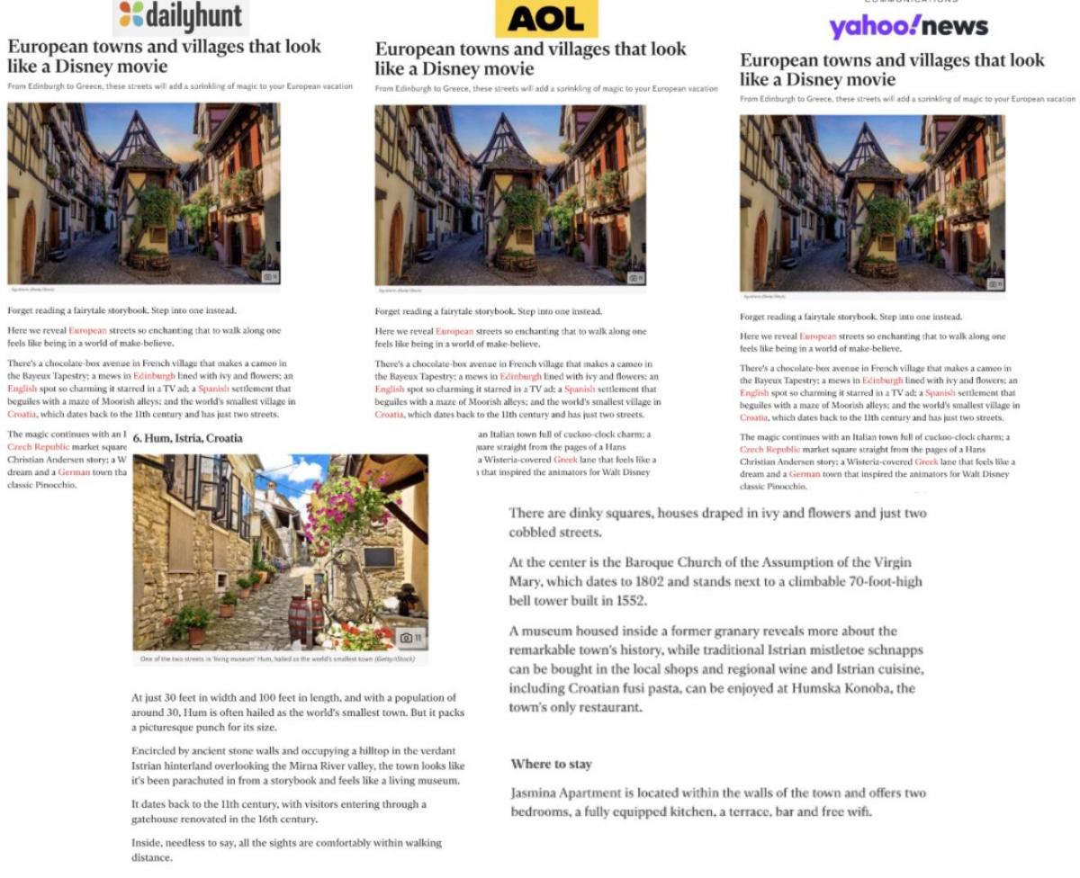 Britanski portali, na čelu s portalom Independent, objavili su članak novinara Teda Thornhilla koji donosi pregled najbajkovitijih europskih gradića i sela – onih čije ulice, arhitektura i atmosfere podsjećaju na prizore iz Disneyjevih filmova. Među odabranim destinacijama istaknuto je i istarsko selo Hum, predstavljeno kao “živi muzej” i često nazvano najmanjim gradom na svijetu. U tekstu se opisuje njegov srednjovjekovni karakter, kamene ulice obrasle vegetacijom, povijesne zidine te bogata lokalna tradicija, uključujući izvornu istarsku kuhinju i proizvodnju domaće rakije od imele. Čitateljima se Hum prikazuje kao čarobno, minijaturno i iznimno slikovito mjesto jedinstvenog identiteta, čime se dodatno potvrđuje međunarodna atraktivnost istarskog zaleđa. Uz impresivnih 19.600.000 jedinstvenih mjesečnih korisnika portala The Independent, vijest o Humu i Istri dodatno je proširila svoj doseg zahvaljujući sindiciranju na brojnim međunarodnim platformama.