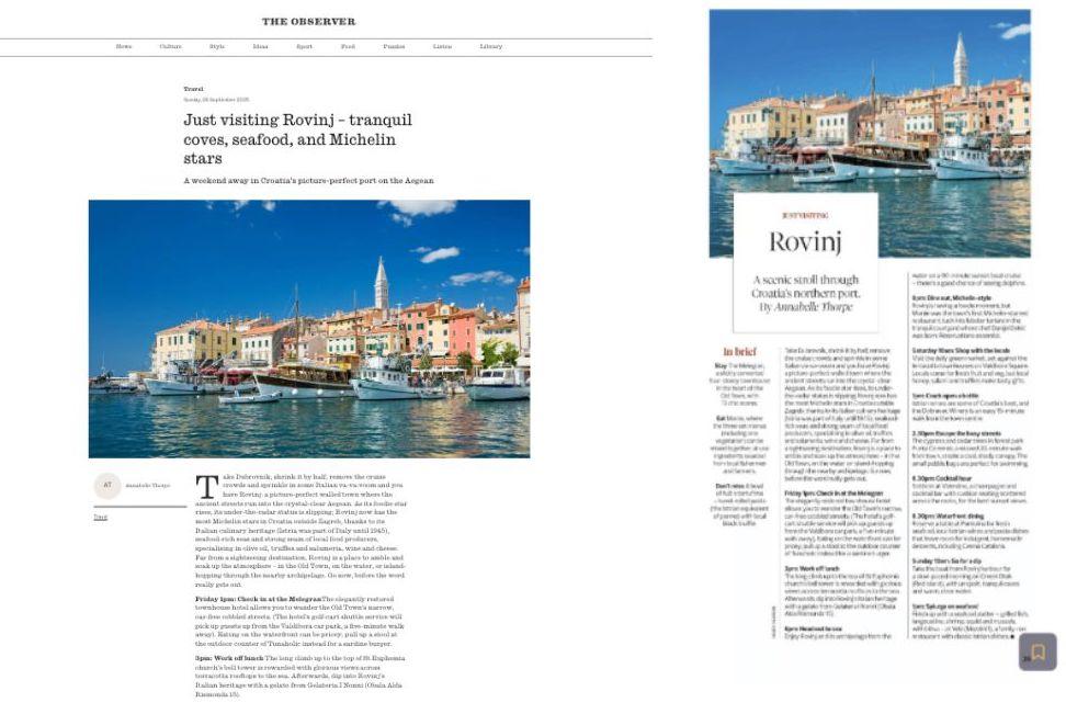 Britanski portal The Observer, kroz putopisnu kolumnu novinarke Annabelle Thorpe, objavio je članak posvećen Rovinju pod naslovom „Just visiting Rovinj – tranquil coves, seafood, and Michelin stars“. Autorica opisuje Rovinj kao slikoviti gradić na obali Jadrana koji kombinira šarm stare Italije, mir skrivenih uvala i vrhunsku gastronomsku scenu. Tekst naglašava kako Rovinj sve više izlazi iz okvira „skrivene destinacije“ zahvaljujući kulinarskom usponu – odmah iza Zagreba po broju Michelinovih zvjezdica, što duguje snažnoj talijanskoj baštini, kvaliteti lokalnih namirnica i bogatstvu mora. Putopis vodi čitatelja kroz trodnevni boravak – od uspona na zvonik sv. Eufemije i opuštajuće šetnje starogradskim ulicama, do posjeta tržnici i vinskom podrumu Dobravac, plovidbe među otočjem i uživanja u zalasku sunca iz bara Valentino. Istaknuta su i poznata imena istarske gastronomije, poput restorana Monte, Puntulina i Vela. Autorica tekstom prenosi iskustvo odmora u kojem se luksuz ne ogleda samo u usluzi, već u opuštenom ritmu, bogatoj ponudi i autentičnosti mjesta. Članak je objavljen u tiskanom izdanju u 549.549 primjeraka, te u digitalnom izdanju gdje portal The Observer broji 1,4 milijuna jedinstvenih mjesečnih korisnika.