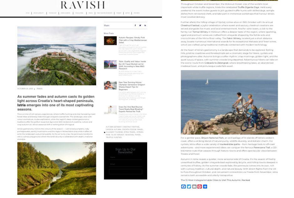 Ravish Magazine objavio je članak posvećen jesenskom doživljaju Istre. Tekst, objavljen u rubrici Travel, donosi bogatu i inspirativnu reportažu o transformaciji Istre u jedno od najprivlačnijih odredišta Europe tijekom jeseni. Autor članka opisuje kako jesen u Istri donosi harmoniju boja, okusa i mirisa – od lova na tartufe i branja maslina, do šetnji šumama i vožnji biciklom kroz brežuljke prekrivene vinogradima. Ističu se Zigante Truffle Days u Motovunskoj šumi, koje se održavaju svakog vikenda u listopadu i studenom, te Festival kestena u Oprtlju 19. listopada, kao primjeri autentičnih lokalnih manifestacija koje slave prirodna bogatstva regije. Poseban prostor posvećen je istarskoj vinskoj sceni, s naglaskom na vinarije Tomaz i Fakin, poznate po visokokvalitetnim Malvazijama i Teranima. Uz gastronomiju, tekst poziva na istraživanje prirode: od pješačenja rutom Grdoselo – Zelengrad, do bicikliranja po Parenzani i posjeta Nacionalnom parku Brijuni. Ravish Magazine članak pozicionira Istru kao lako dostupnu destinaciju za britansko tržište, zahvaljujući direktnim letovima za Pulu do kraja listopada i povezivanju preko Trsta u studenom.