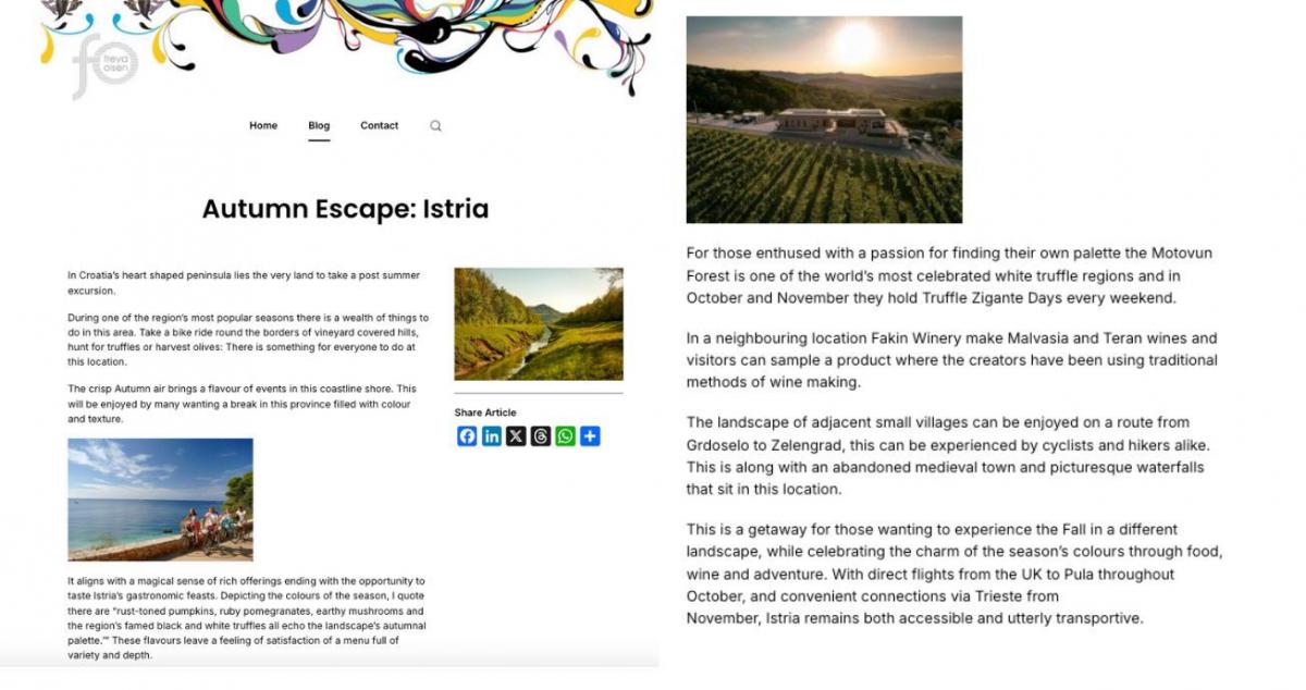 Britanski lifestyle blog-portal objavio je članak pod nazivom Autumn Escape: Istria, u kojem preporučuje Istru kao idealnu destinaciju za jesenski odmor. Tekst donosi poetski prikaz istarske jeseni kroz raznovrsne aktivnosti poput bicikliranja kroz vinorodne brežuljke, branja maslina, lova na tartufe i šetnji kroz prirodu. Posebno je istaknuta gastronomska ponuda regije, s naglaskom na sezonske okuse i boje – od bundeva i šipaka do gljiva i bijelih tartufa. Portal opisuje manifestaciju Zigante Truffle Days kao vrhunac jesenske ponude, a preporučuje i posjet vinarijama poput vinarije Fakin u Motovunu. Za ljubitelje aktivnog odmora, tekst predlaže rutu između Grdosela i Zelengrada, s napuštenim srednjovjekovnim mjestom i slapovima, kao i uživanje u jesenskom krajoliku.