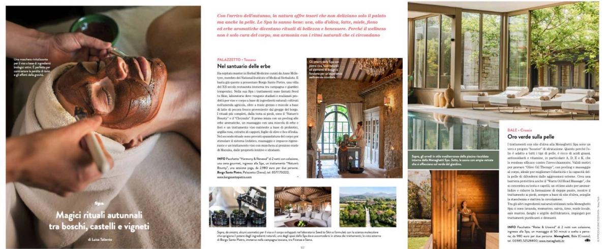 Talijanski magazin Natural Style, u svom izdanju za listopad 2025., objavio je članak novinarke Luise Taliento pod naslovom “Sogno Spa”, u kojem predstavlja najinspirativnije jesenske wellness destinacije diljem Europe. Među odabranim lokacijama posebno se ističe Meneghetti Wine Hotel & Winery u Balama, čiji se Meneghetti Spa opisuje kao istarska oaza ljepote i zdravlja u kojoj maslinovo ulje igra ključnu ulogu u tretmanima njege kože i relaksacije. U članku se navode blagodati maslinovog ulja za kožu – bogatstvo antioksidansa, vitamina A, D, E i K – te se ističu tretmani poput “Olive Oil Therapy”, “Warm Oil Head Massage” i masaže stopala koji pomažu u hidrataciji, elastičnosti i revitalizaciji kože. Pored maslinovog ulja, koriste se i drugi prirodni sastojci s istarskog područja, poput lavande, ružmarina, kadulje, meda, soli i blata iz Jadrana. Meneghetti je predstavljen kao luksuzna destinacija koja spaja mediteranski ambijent, visoke standarde wellnessa i autentičnost Istre, čime dodatno doprinosi međunarodnoj prepoznatljivosti regije.