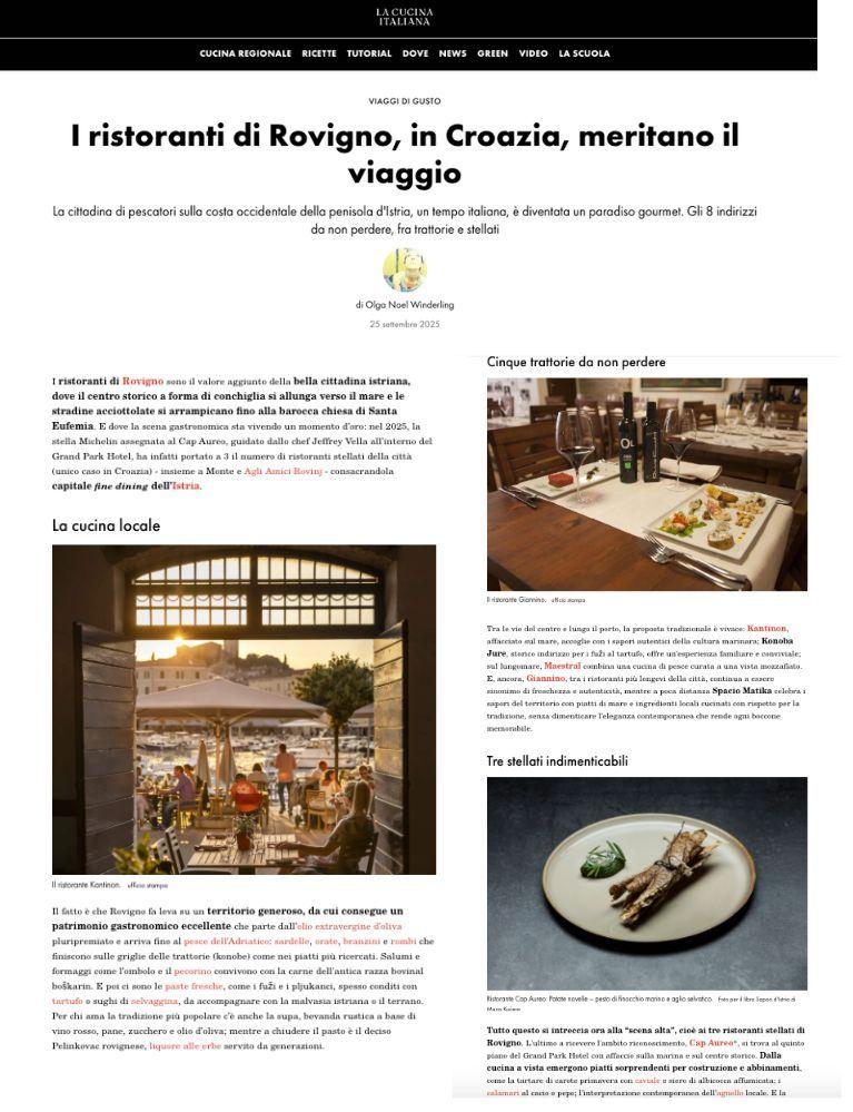Talijanski kulinarski magazin La Cucina Italiana objavio je članak autorice Olge Noel Winderling, u kojem se Rovinj predstavlja kao gourmet destinacija s tri restorana s Michelinovom zvjezdicom, što ga čini jedinim gradom u Hrvatskoj s tolikom visokom kuhinjskom ponudom, te kao grad u kojem se tradicija i inovacija susreću kroz vrhunsku gastronomiju. Autorica navodi osam restorana koje vrijedi posjetiti, od konobi do fine dining institucija u kojima se koriste domaći sastojci poput istarskog maslinovog ulja, tartufa i boškarina. Članak opisuje kako Rovinj svoj estetski šarm starih kamenih ulica, prošarane kuće i marina pretvara u kulinarski centar Istre, zahvaljujući ne samo lokaciji i baštini već i konceptu vrhunskog odmora za ljubitelje dobre hrane.