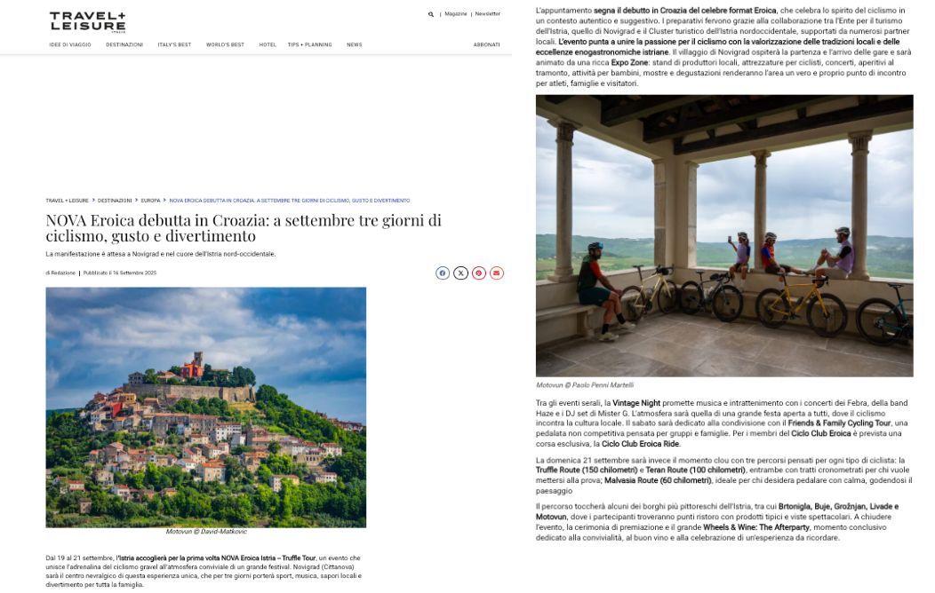 Prestižni talijanski magazin Travel + Leisure Italia objavio je članak o prvom izdanju manifestacije NOVA Eroica Istria – Truffle Tour, koje se održalo od 19. do 21. rujna u sjeverozapadnoj Istri s Novigradom kao glavnim domaćinom. Tekst opisuje ovu trodnevnu manifestaciju kao autentičan spoj sporta, glazbe, okusa i obiteljske zabave. Članak ističe kako je riječ o premijernom izdanju poznatog biciklističkog formata Eroica u Hrvatskoj, koji je u Istru donio jedinstvenu kombinaciju gravel biciklizma i isticanja lokalne kulture. Uz podršku Turističke zajednice Istarske županije, Turističke zajednice Novigrada i Klastera sjeverozapadne Istre, događaj je okupio brojne lokalne partnere te privukao sudionike i posjetitelje svih uzrasta.