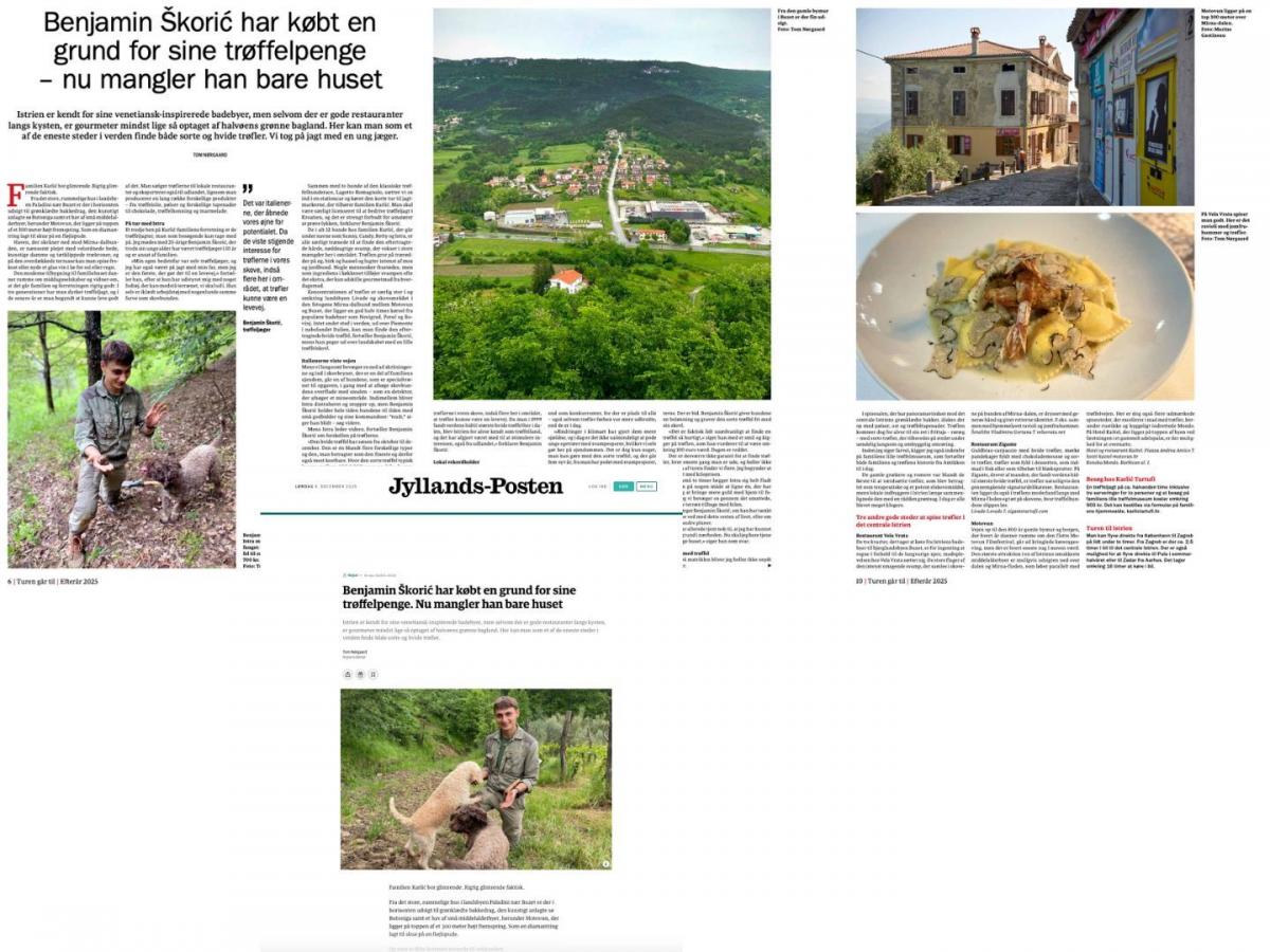 Danski dnevni list Jyllands-Posten, kroz članak novinara Toma Nørgaarda, donosi opsežan reportažni prikaz jesenske ponude središnje Istre, s posebnim naglaskom na tradiciju tartufarenja i gastronomsku baštinu regije. Kroz priču o mladom tartufaru Benjaminu Škoriću, zaposleniku obitelji Karlić, čitatelji se upoznaju s ritualima i stvarnošću tartufarskog života – od jutarnjih izlazaka sa psima u motovunske šume do trenutka pronalaska dragocjenih plodova zemlje, kako crnih tako i bijelih tartufa. Naglašena je i činjenica da je Istra, uz Pijemont, jedno od rijetkih svjetskih područja gdje raste bijeli tartuf, čija vrijednost doseže i do 5.000 eura po kilogramu.
