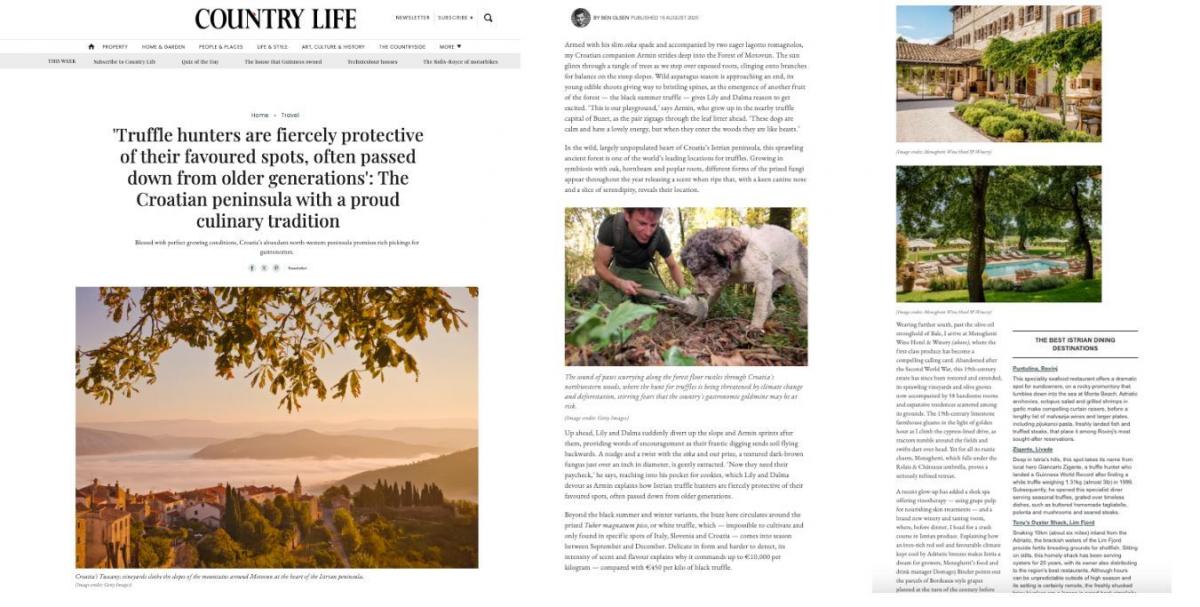 U kolovoškom izdanju prestižnog britanskog magazina Country Life, novinar Ben Olsen donosi sveobuhvatnu reportažu o Istri, s naglaskom na njezinu bogatu gastronomsku tradiciju, sezonske delicije i pejzažnu ljepotu. Kroz osobno iskustvo tragača za tartufima u Motovunskoj šumi, tekst donosi intiman pogled na lokalnu strast, tradiciju i znanje koje se prenosi generacijama, posebno u Buzetskom kraju. Istra je prikazana kao jedno od vodećih svjetskih područja za bijele i crne tartufe, čija sezona i vrijednost dodatno pozicioniraju regiju na karti najtraženijih eno-gastro destinacija. Poseban naglasak stavljen je na evoluciju tartufarstva – od vremena kad su se tartufi smatrali „smrdljivim krumpirima“, preko razdoblja krijumčarenja u Italiju, do današnjeg procvata industrije potpomognute Guinnessovim rekordom 1999. godine.